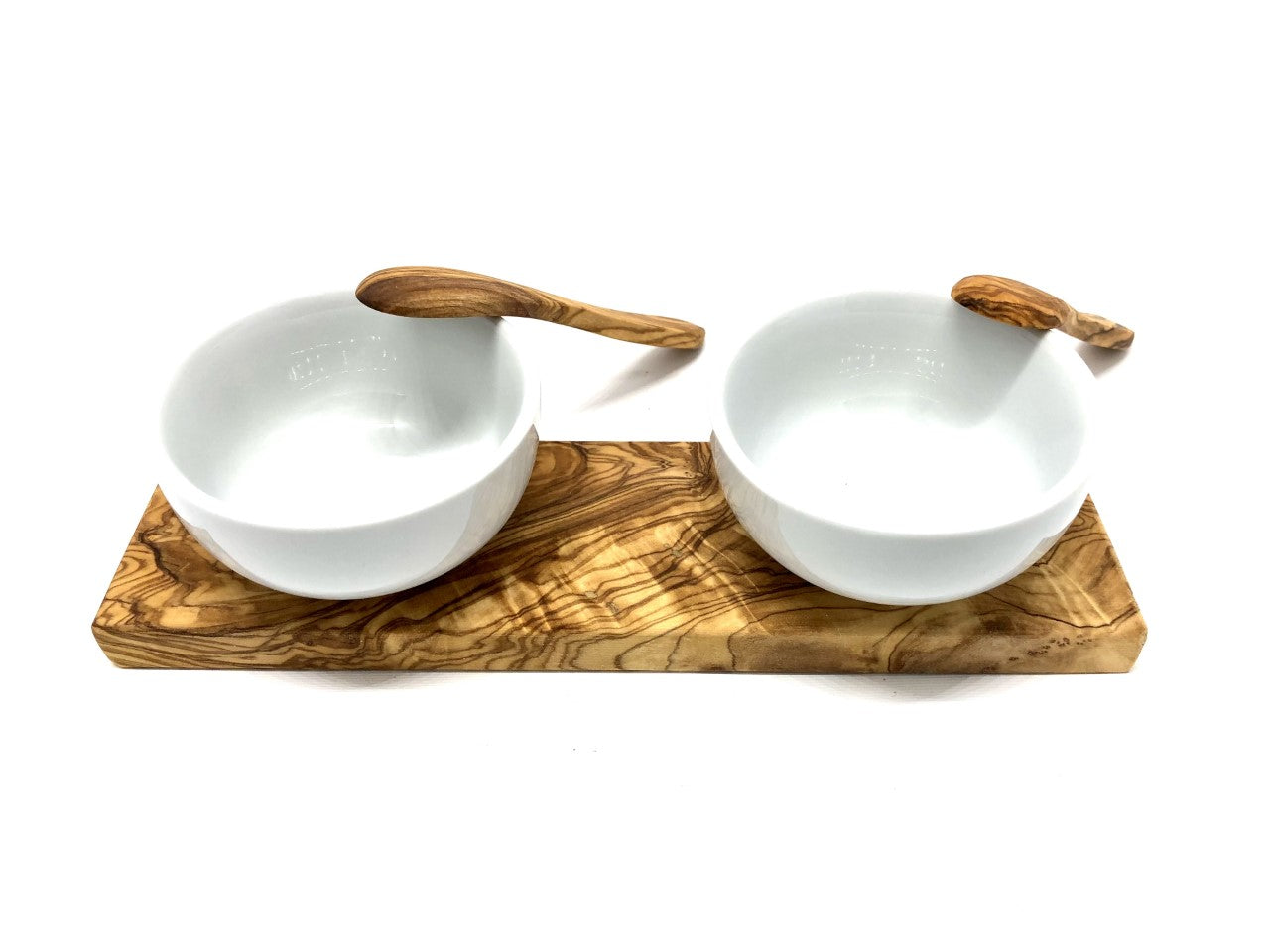 Dieses formschöne Set besteht aus zwei weißen Porzellan-Dipschalen, die passgenau in einen massiven Sockel aus fein gemasertem Olivenholz eingelassen sind.