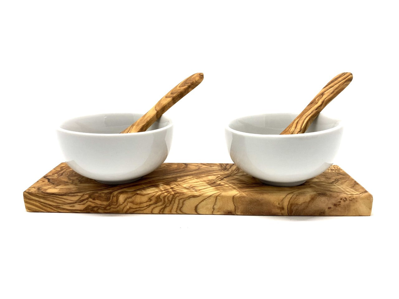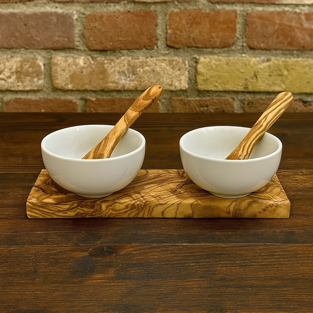 2er-Set Dipschalen aus Porzellan mit Olivenholzsockel & Löffeln