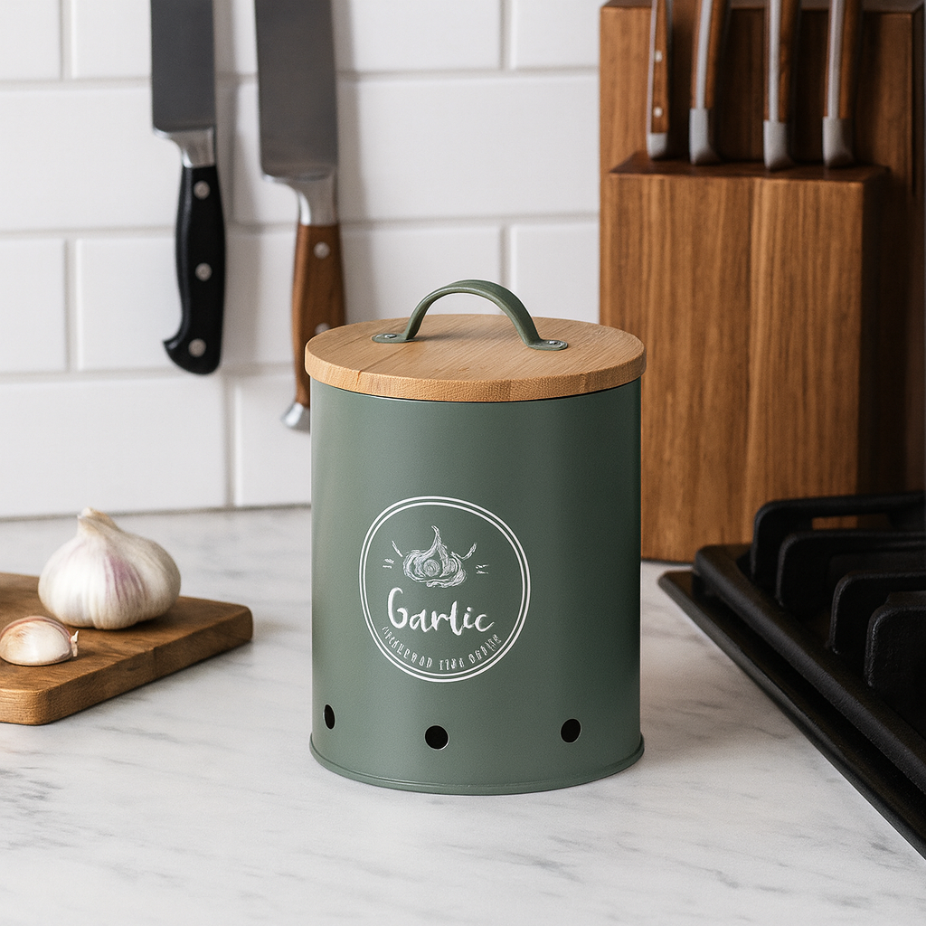 Diese grüne Knoblauchdose bringt Ordnung und Frische in deine Küche.