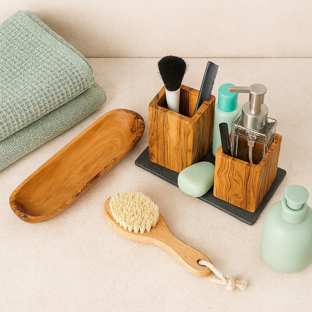 Diese stilvolle Badablage aus massivem Olivenholz schafft Ordnung und bringt zugleich ein warmes, mediterranes Flair in dein Badezimmer.