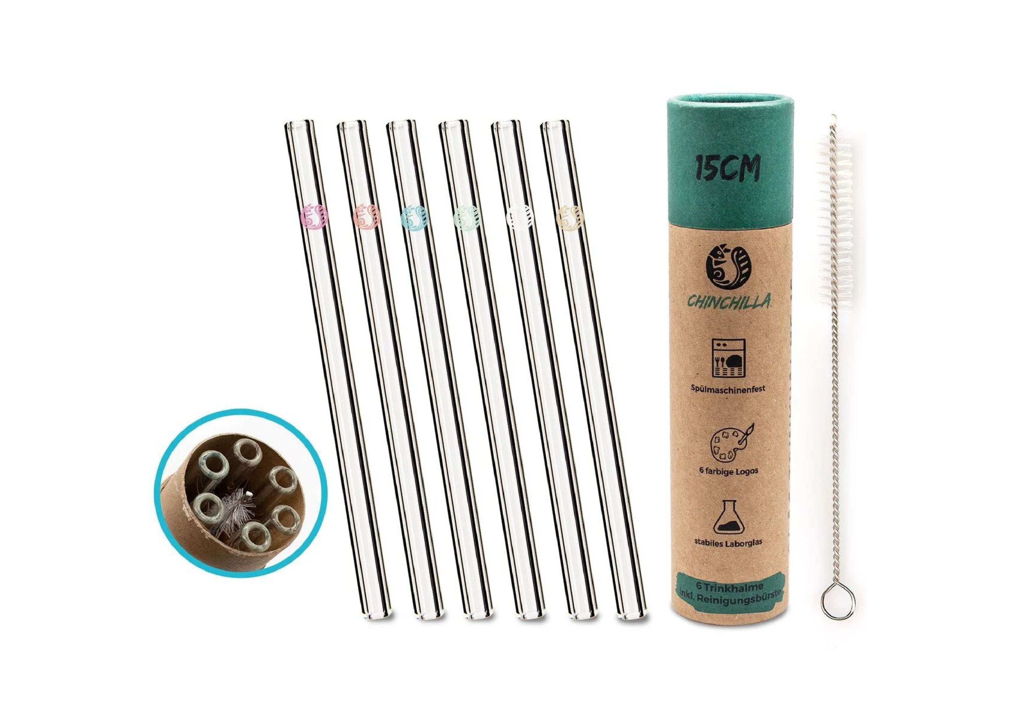 6 Glastrinkhalme mit farbigen CHINCHILLA-Logos