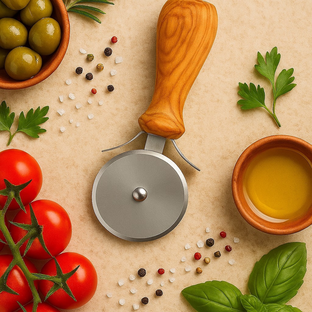 Der Pizzaschneider mit handgearbeitetem Olivenholzgriff überzeugt nicht nur durch seine edle Optik, sondern auch durch präzise Schneidkraft.