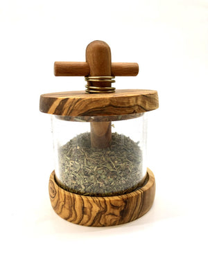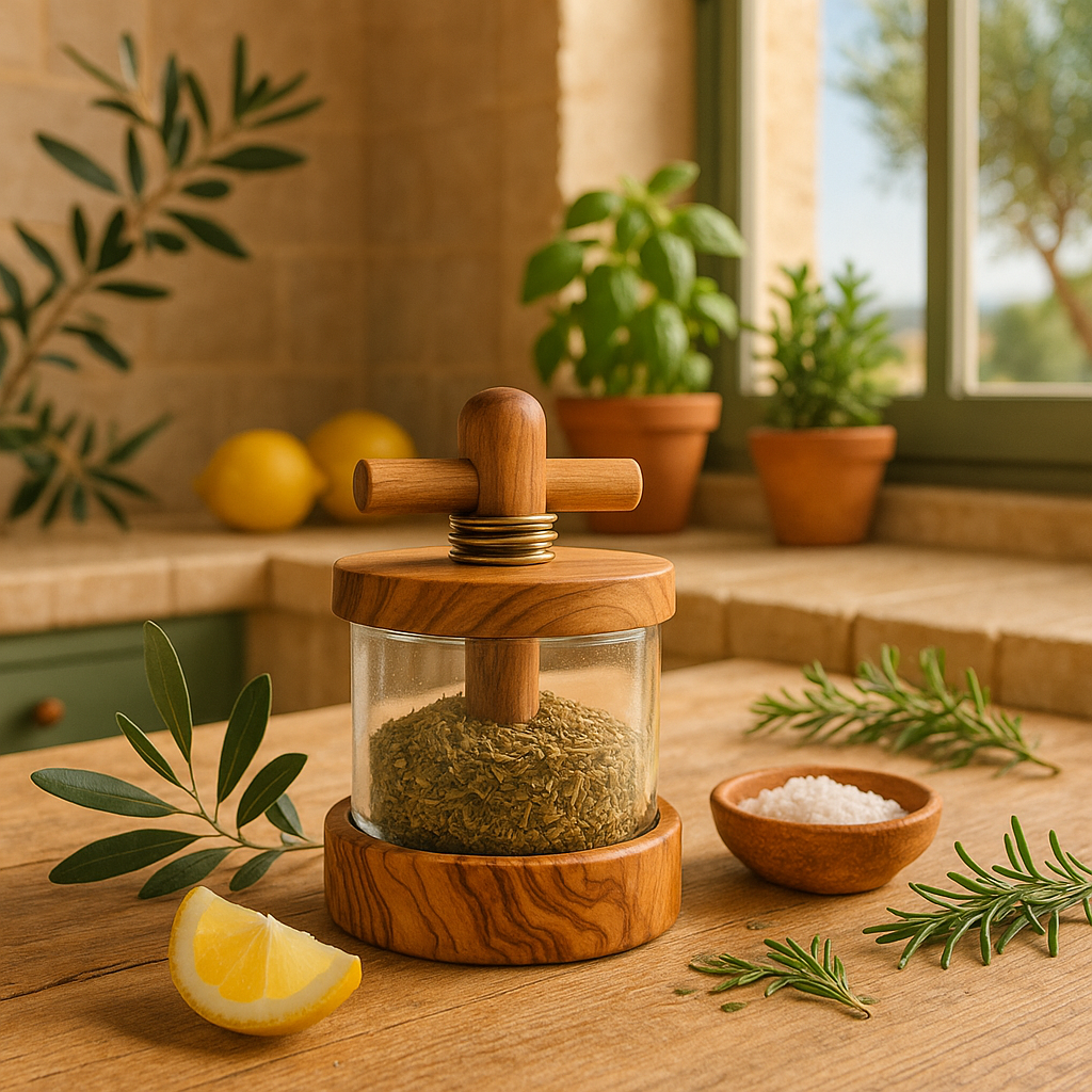Diese kompakte Kräutermühle vereint edles Olivenholz mit funktionalem Design für den täglichen Einsatz in der Küche.