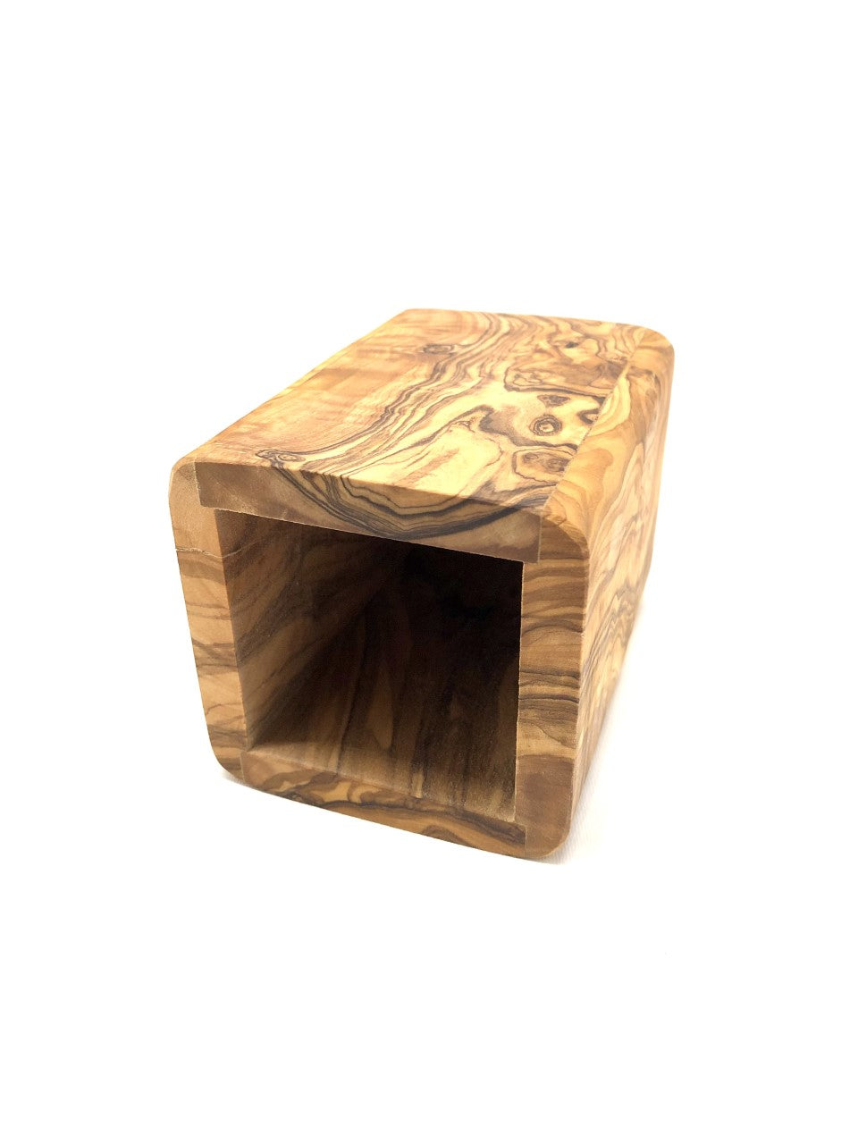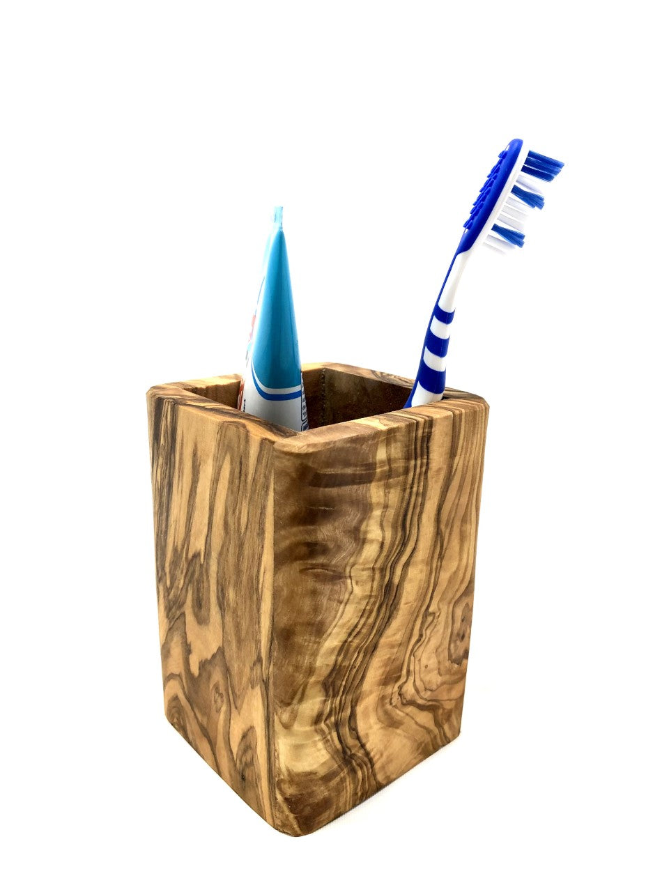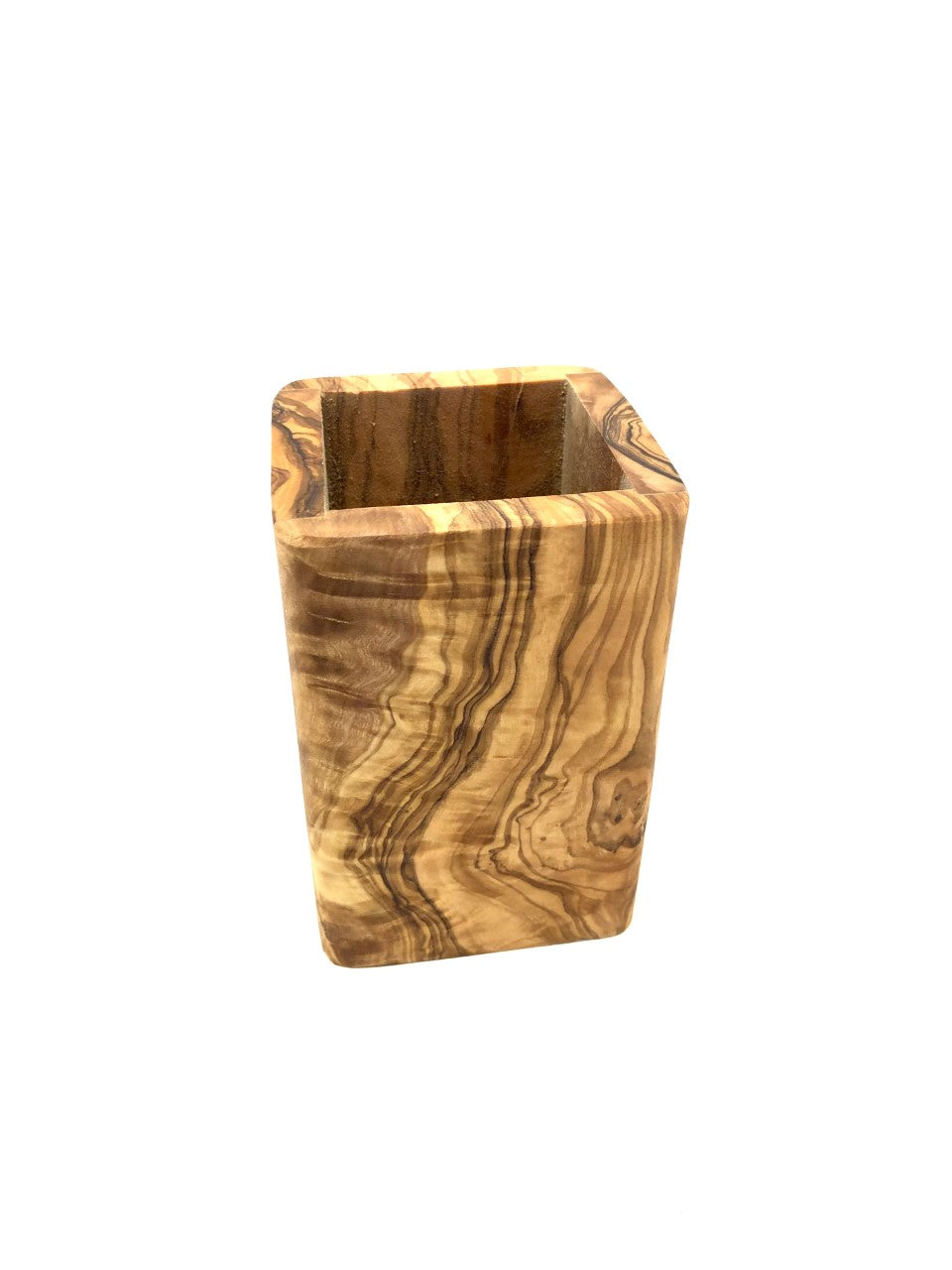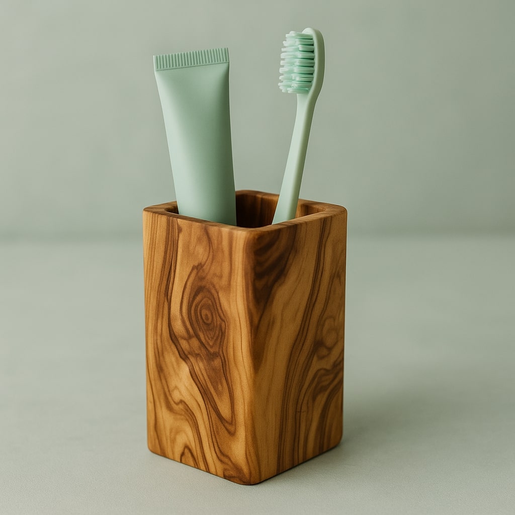 Dieser eckige Zahnputzbecher aus hochwertigem Olivenholz vereint moderne Formgebung mit natürlicher Ausstrahlung.