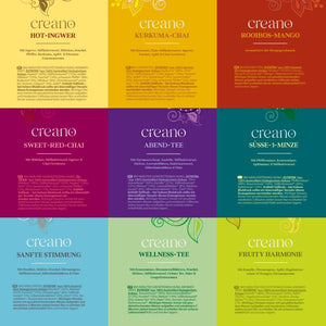 Jede Creano Bio-Teemischung wird in Deutschland entwickelt und in Europa produziert. Für alle Produkte werden ausschließlich beste Bio-Kräuter, -Früchte und -Gewürze verwendet. Creano ist Mitglied im Deutschen Tee- & Kräuterteeverband und verpflichtet sich zum „Code of Conduct“ – einem Verhaltenskodex, der Qualitätssicherung, Rückstandskontrollen sowie soziale und ökologische Standards umfasst.