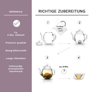 Dieses Geschenkset vereint feinen schwarzen Tee, kunstvoll gebundene Blüten und eine stilvolle Glaskanne zu einem außergewöhnlichen Teeerlebnis. Die ErblühTee-Kugeln entfalten sich beim Aufguss zu faszinierenden Blütenkompositionen und schenken ein Schauspiel für alle Sinne – ein besonderes Geschenk für Teeliebhaber, Genießerinnen und all jene, die Teekultur lieben.