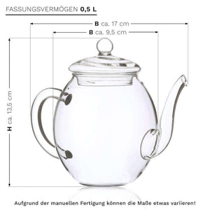 Die mitgelieferte Glaskanne wurde speziell für den ErblühTee entwickelt. Sie besteht aus hitzebeständigem, mundgeblasenem Borosilikatglas, ist spülmaschinenfest, mikrowellengeeignet und 100 % tropffrei.