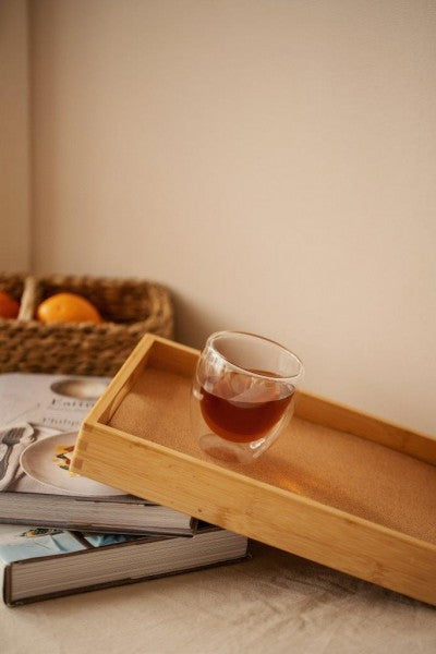 Dieses Bambus-Tablett ist ein funktionales Wohn-Accessoire mit besonderem Detail: einem Kork-Inlay, das als Anti-Rutsch-Fläche dient.