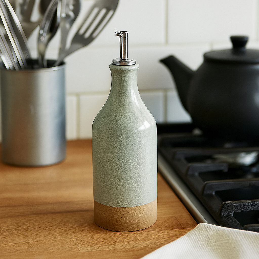 Moderne Essig-/Ölflasche aus glasiertem Steingut mit elegantem Edelstahl-Dispenser