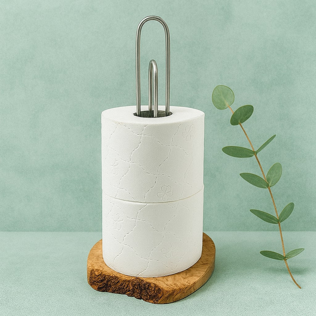 Der WC-Rollen-Ständer aus hochwertigem Olivenholz bringt Ordnung in kleine Räume – ideal für Gäste-WCs oder minimalistische Badezimmer.