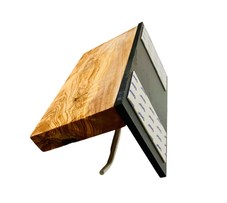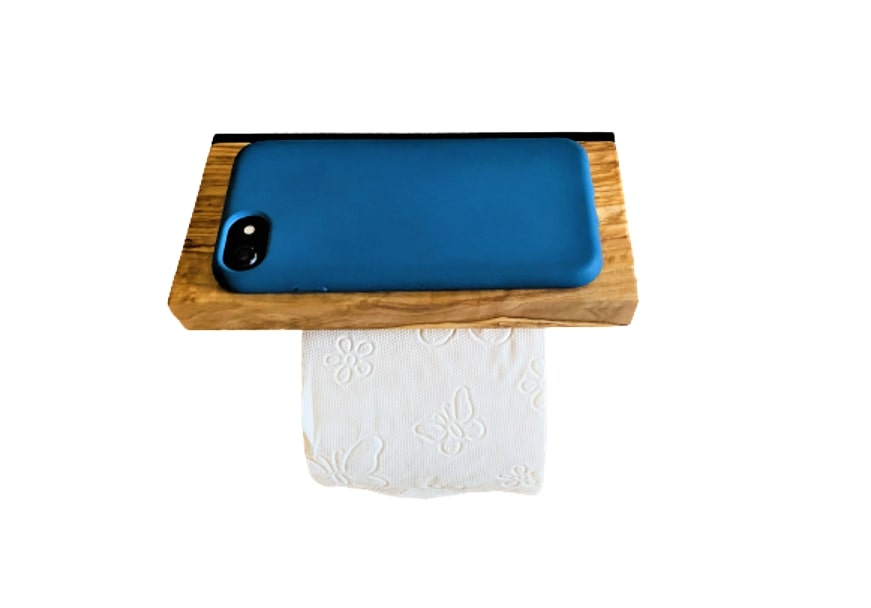 Der WC-Rollenhalter „MAINZ“ überzeugt mit praktischer Smartphone-Ablage und natürlichem Olivenholz-Charakter.